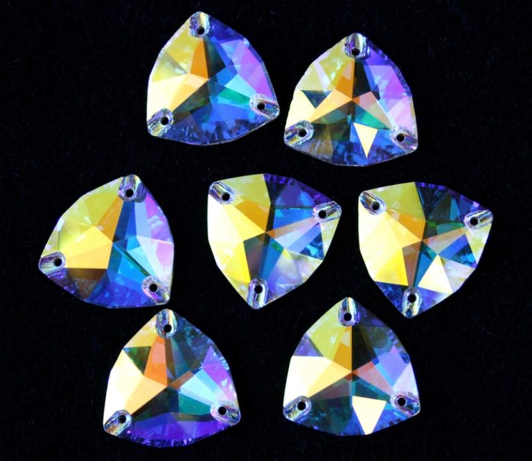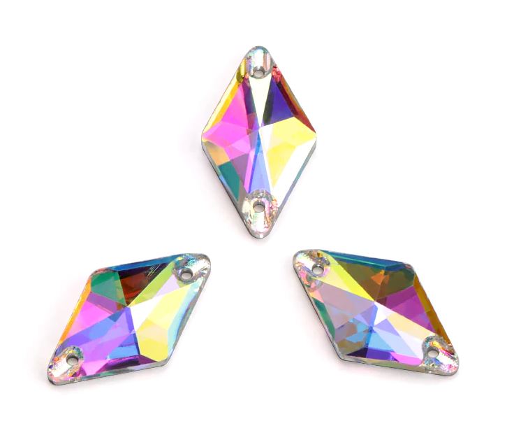 Tört rombusz alakú varrható kristálykő kristály AB színben, 11x14, 14x18, 16x20, 21x26, 27x34 mm-es méretben. Szikrázó fényű kő. Anyaga: kristályüveg.