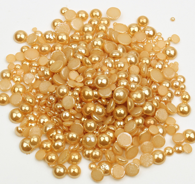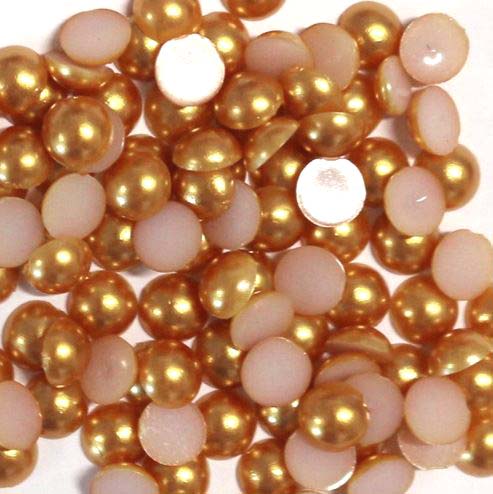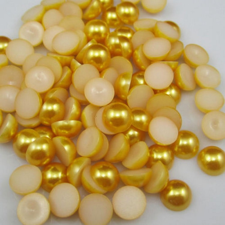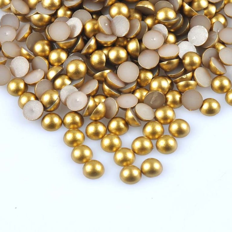 Műanyag, ragasztható félgyöngy sárgásarany színben, prémium minőségben. Méretek: 5 és 6 mm. Az ár 1 csomag gyöngyre értendő.