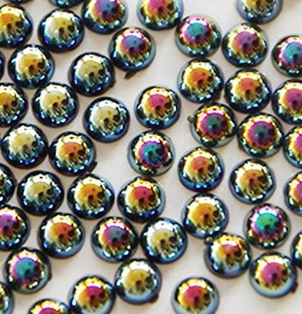 Műanyag, ragasztható félgyöngy fekete alapú, irizáló AB réteggel bevont árnyalat. Méretek: 5, 6 és 8 mm. Az ár 1 csomag gyöngyre értendő.