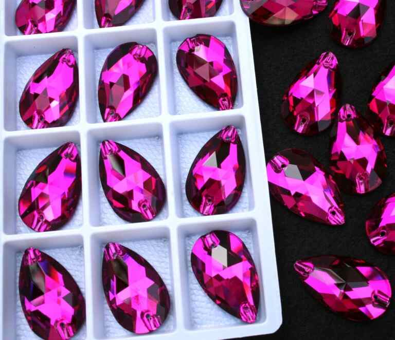 Csepp alakú varrható kristálykő világos rózsaszín színben, 7x12, 10,5x18, 13x22, 17x28 mm-es méretben. Szikrázó fényű kő. Anyaga: kristályüveg.
