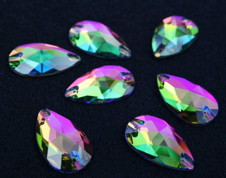 Csepp alakú varrható kristálykő szivárvány színben, 7x12, 10,5x18, 13x22, 17x28 mm-es méretben. Szikrázó fényű kő. Anyaga: kristályüveg.
