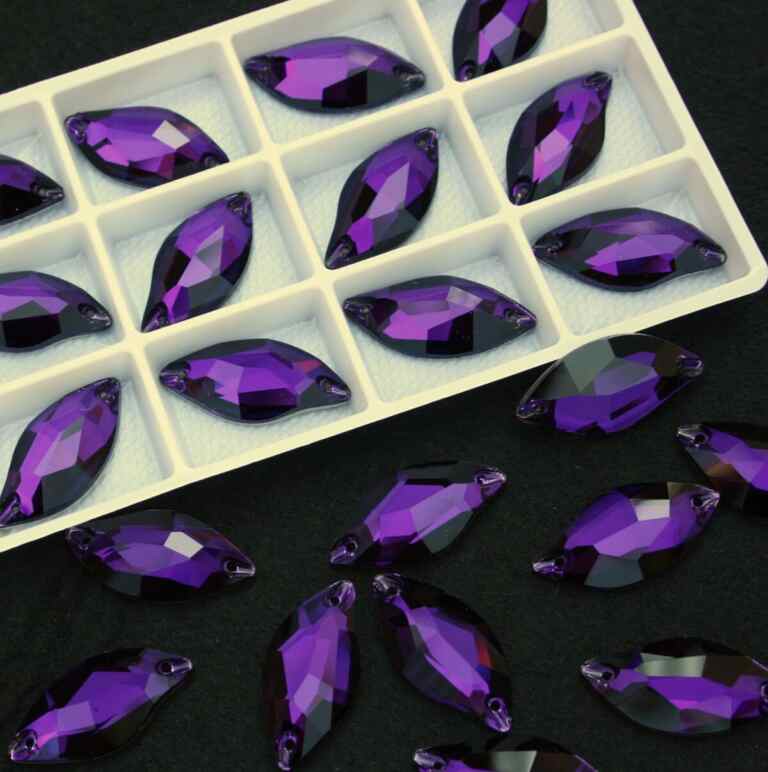 Ovális alakú varrható kristálykő sötétlila színben, 11x16, 17x24 mm-es méretben. Csillogó, prémium csiszolású kő. Anyaga: kristályüveg.