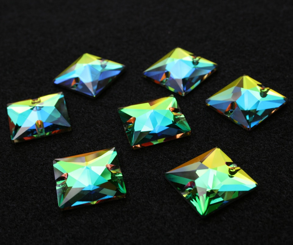 Négyzet alakú varrható kristálykő szivárvány színben, 12x12, 16x16, 22x22 mm-es méretben. Prémium csiszolású kő. Anyaga: kristályüveg.