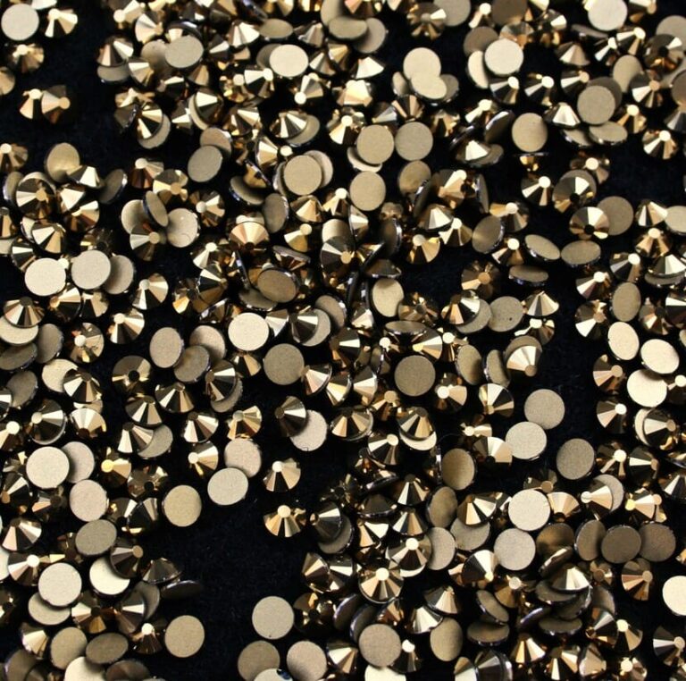 Szürke árnyalatú, aranylóan irizáló bevonatos ragasztható strasszkő SS16, SS20 és SS30-as méretben. Prémium minőségű, csillogó kristálykő.