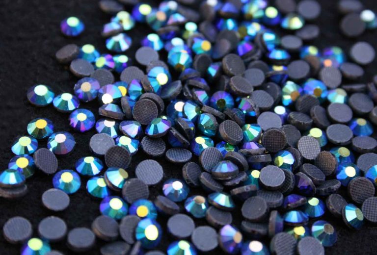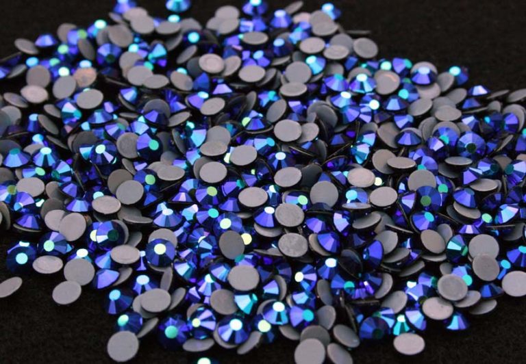 Fekete alapú, irizáló AB árnyalatú, normál minőségű vasalható strasszkő SS20 és SS30-as méretben, hőre olvadó ragasztóval.