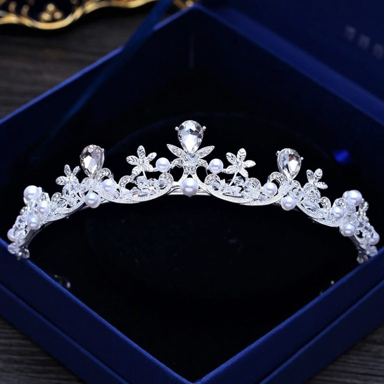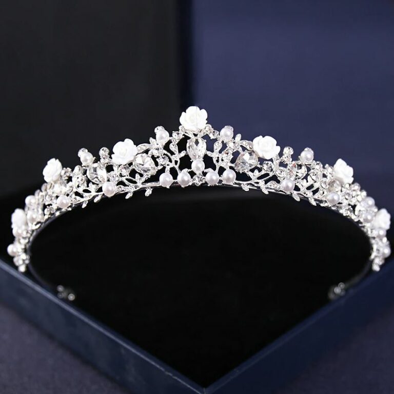 Különleges esküvői fejdísz. Ezüstszínű fém alapú, csillogó kristályokkal, gyöngyökkel és virágokkal díszített menyasszonyi tiara.