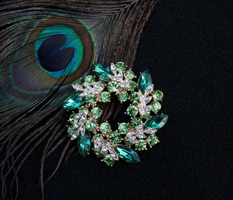 Zöld színű bross - kristály kitűző: 405-zöld modell arany alappal, valamint zöld és kristály színű kövekkel. Tűvel illeszthető ruhadísz, melynek mérete 5,2 cm.