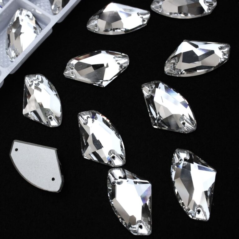 Ék alakú varrható kristálykő kristály színben, 9x14, 12x19, 16x27 mm-es méretben. Csillogó fényű, különleges csiszolású kő. Anyaga: kristályüveg.