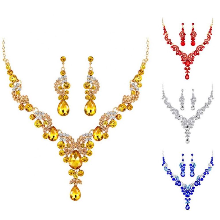 Ragyogó kristályokkal díszített fém alapú nyaklánc és fülbevaló szett. Ezüst, arany, piros és kék színben kapható. Esküvőre, alkalmi viselethez, de akár hétköznapra is ajánljuk.