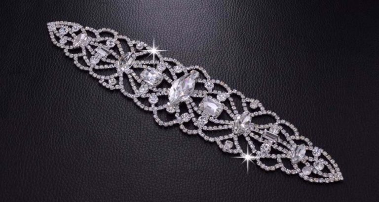 Kristály ruhadísz 117. modell ezüst alappal és kristály színű kövekkel. Könnyen felvarrható, nagyméretű ruhadísz: 22x5 cm nagyságú.