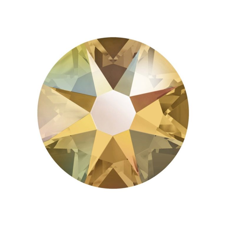 Arany árnyalatú, aranylóan irizáló bevonatos ragasztható strasszkő SS16, SS20 és SS30-as méretben. Prémium minőségű, csillogó kristálykő.