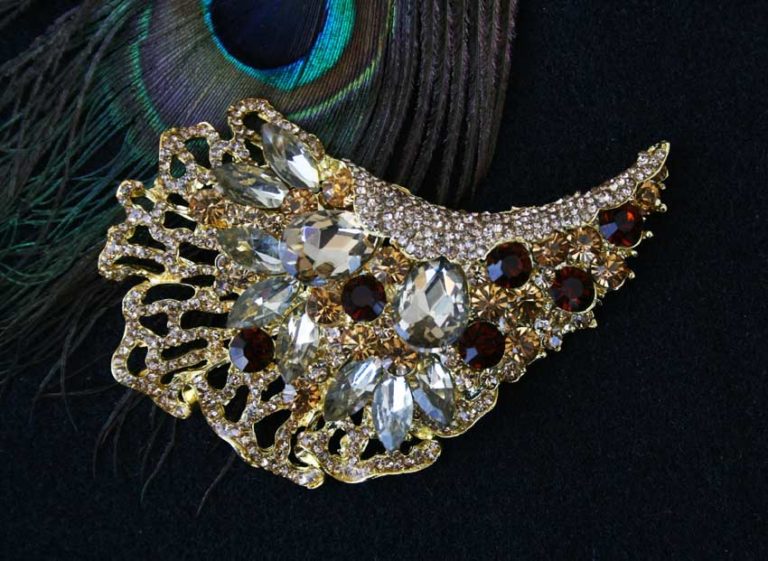 Arany bross - kristály kitűző: 413-arany modell arany alappal; arany valamint barna színű kövekkel. Tűvel illeszthető ruhadísz, melynek mérete 12 cm.