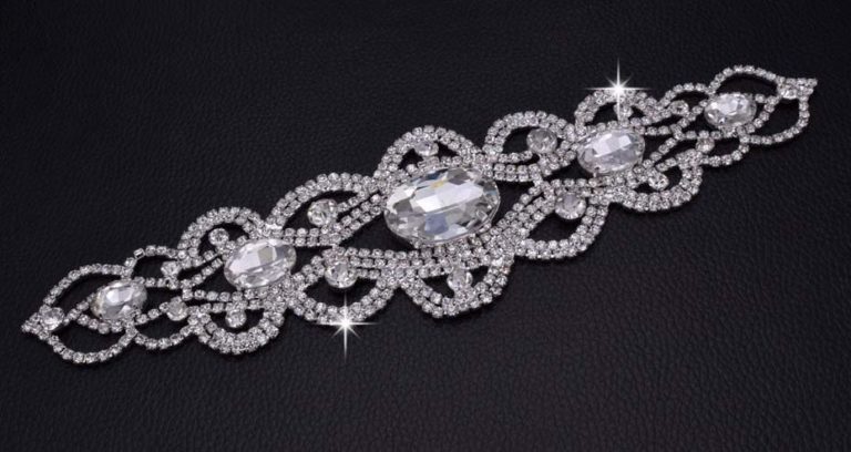 Kristály ruhadísz 119. modell ezüst alappal és kristály színű kövekkel. Könnyen felvarrható, nagyméretű ruhadísz: 22,5x6,1 cm nagyságú.