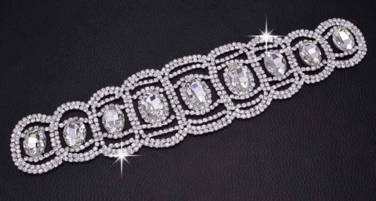 Kristály ruhadísz 120. modell ezüst alappal és kristály színű kövekkel. Könnyen felvarrható, nagyméretű ruhadísz: 23x5,5 cm nagyságú.