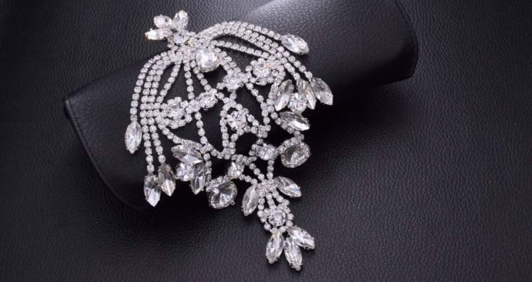 Bújtatható, kisméretű kristálydísz 319. modell: ezüst alappal és kristály színű kövekkel. Bújtató pánttal rögzíthető bross, mérete: 1,4x2 cm.