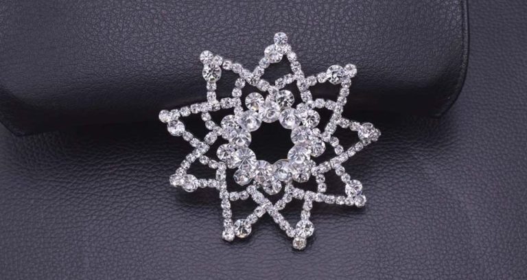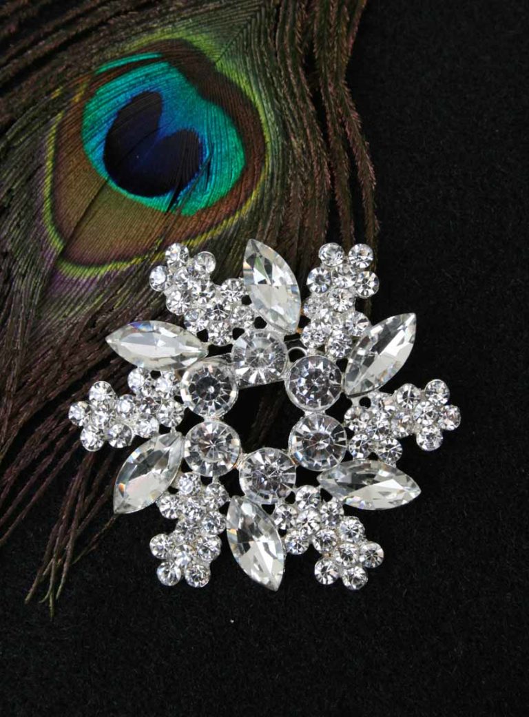 Koszorú alakú bross - kristály kitűző: 419-crystal modell ezüst alappal, valamint kristály színű kövekkel. Tűvel illeszthető ruhadísz, melynek mérete 5,7 cm.