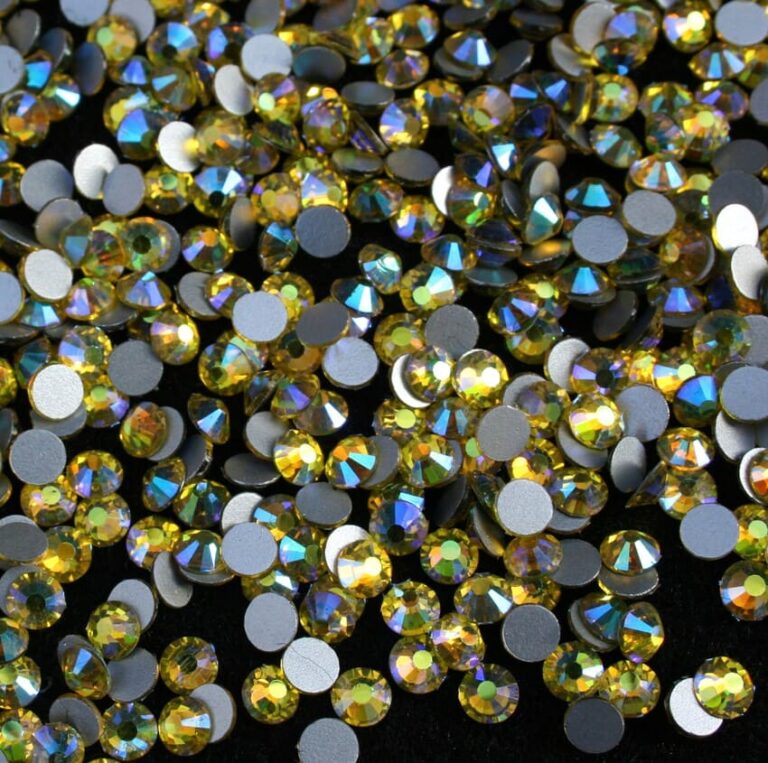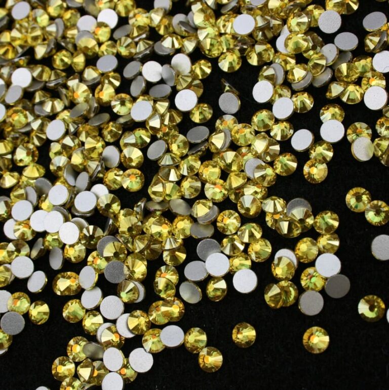 Sárga árnyalatú, aranylóan irizáló AB bevonatos ragasztható strasszkő SS16, SS20 és SS30-as méretben. Prémium minőségű, csillogó kristálykő.