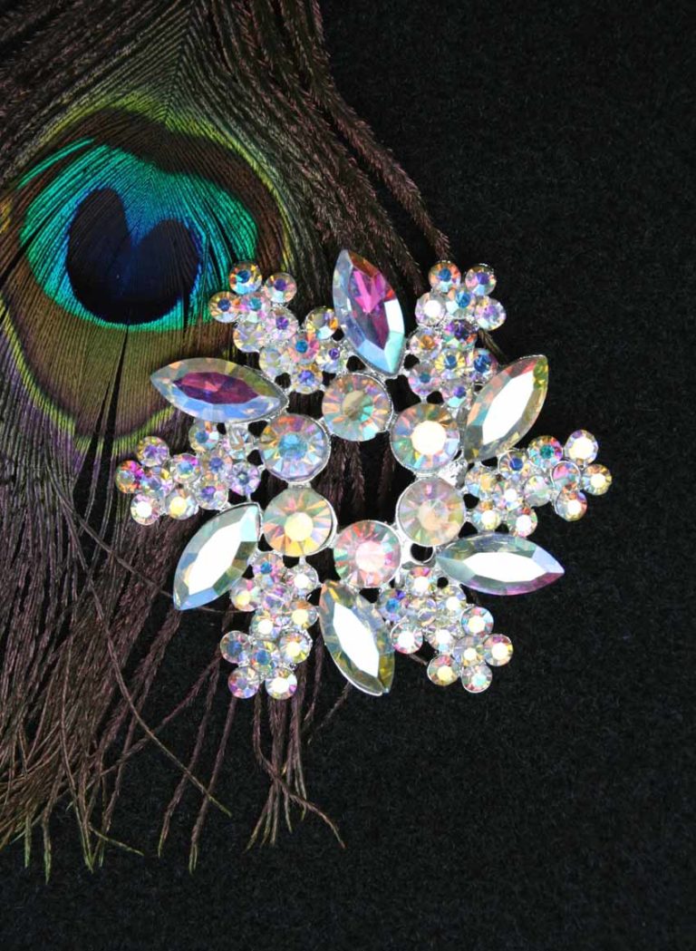 Irizáló AB bross - kristály kitűző: 419-AB modell ezüst alappal, valamint kristály AB színű kövekkel. Tűvel illeszthető ruhadísz, melynek mérete 5,7 cm.