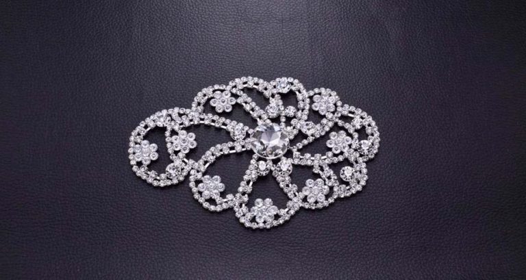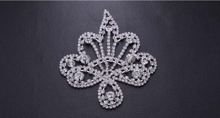 Kristály ruhadísz 129. modell ezüst alappal és kristály színű kövekkel. Könnyen felvarrható, nagyméretű ruhadísz: 12x10,3 cm nagyságú.