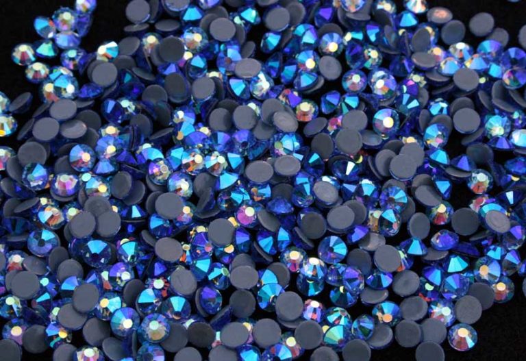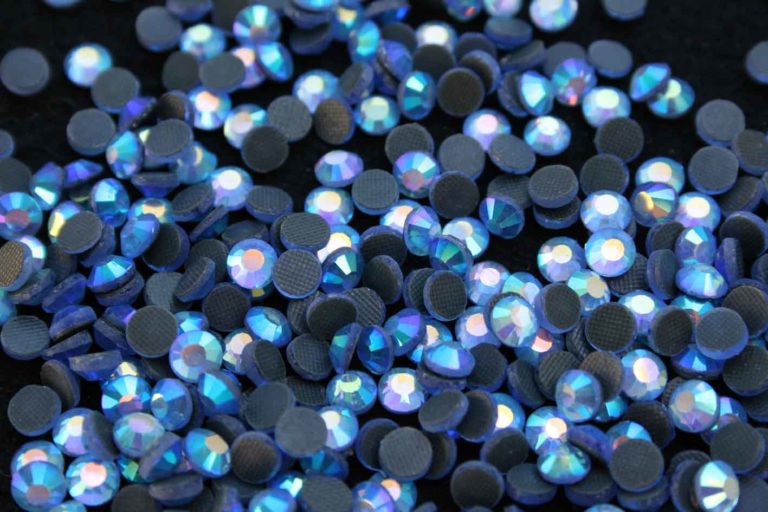 Világoskék alapú, irizáló AB árnyalatú, normál minőségű vasalható strasszkő SS20 és SS30-as méretben, hőre olvadó ragasztóval.