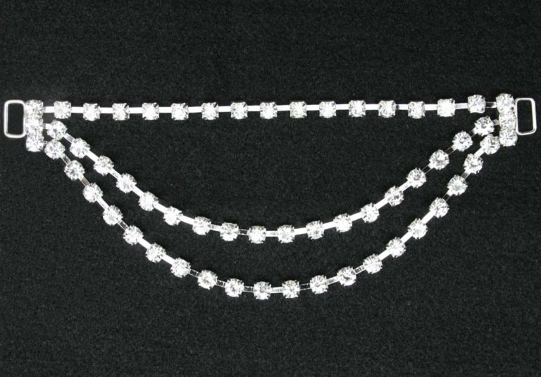Kristály- és bikinipánt 201. modell ezüst alappal és kristály színű kövekkel. Varrással illeszthető strasszpánt, melynek hosszúsága 18 cm.