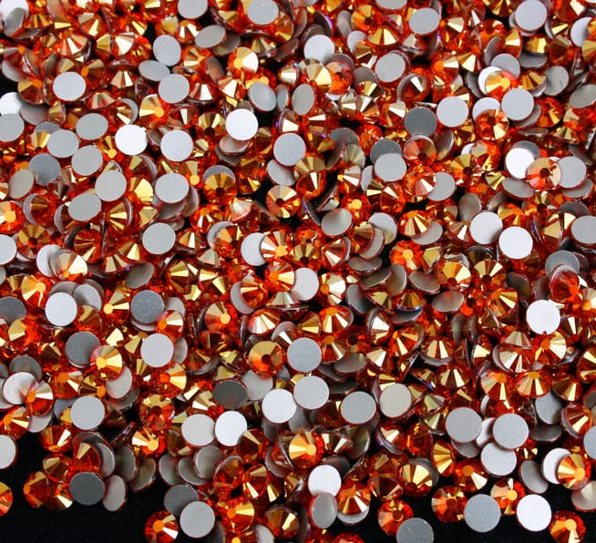 Narancssárga árnyalatú, aranylóan irizáló ragasztható strasszkő SS20-as méretben, xirius metszéssel. Prémium minőségű, ragyogó csiszolású kristálykő.