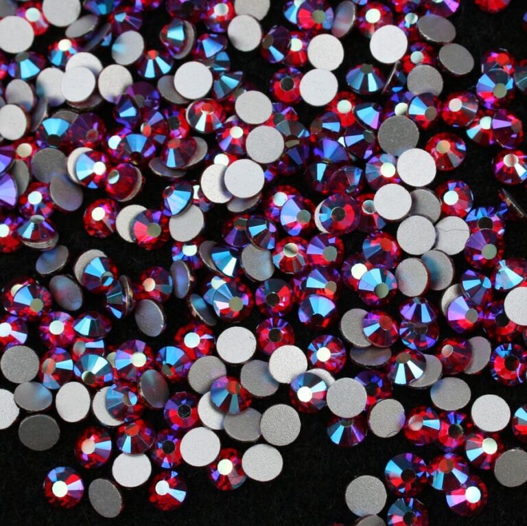 Piros árnyalatú, irizáló AB ragasztható strasszkő SS10, SS12, SS16, SS20 és SS30-as méretben. Prémium minőségű, ragyogó kristálykő.