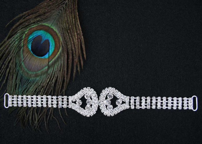 Kristály- és bikinipánt 205. modell ezüst alappal és kristály színű kövekkel. Varrással illeszthető strasszpánt, melynek mérete 19x3 cm.