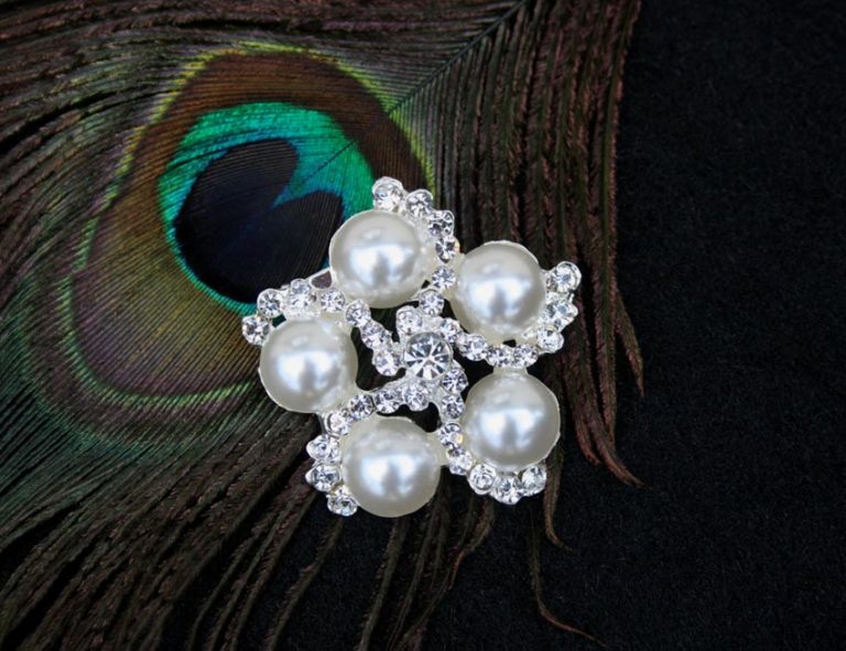 Gyöngyös kristály kitűző: 425. modell ezüst alappal, gyöngyökkel, valamint kristály színű kövekkel. Tűvel illeszthető ruhadísz, melynek mérete 4,3 cm.