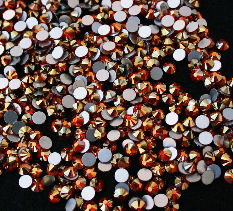 Aranylóan irizáló AB bevonatos, piros árnyalatú ragasztható strasszkő SS16, SS20 és SS30-as méretben. Prémium minőségű, csillogó kristálykő.