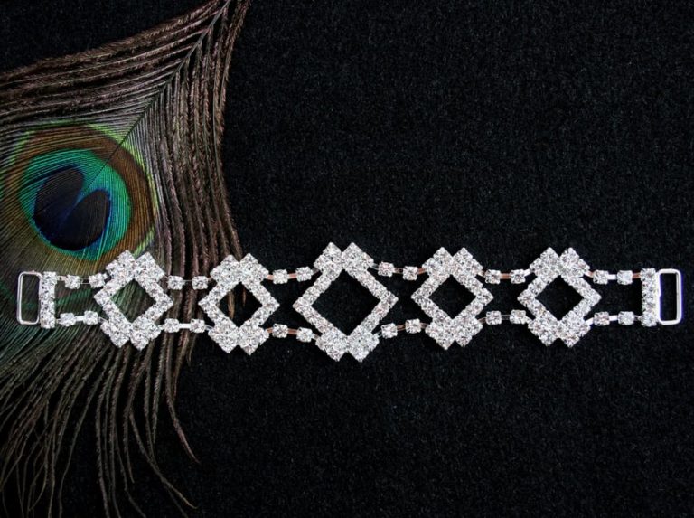 Kristály- és bikinipánt 205-17 cm-es modell ezüst alappal és kristály színű kövekkel. Varrással illeszthető strasszpánt, melynek mérete 17x3 cm.