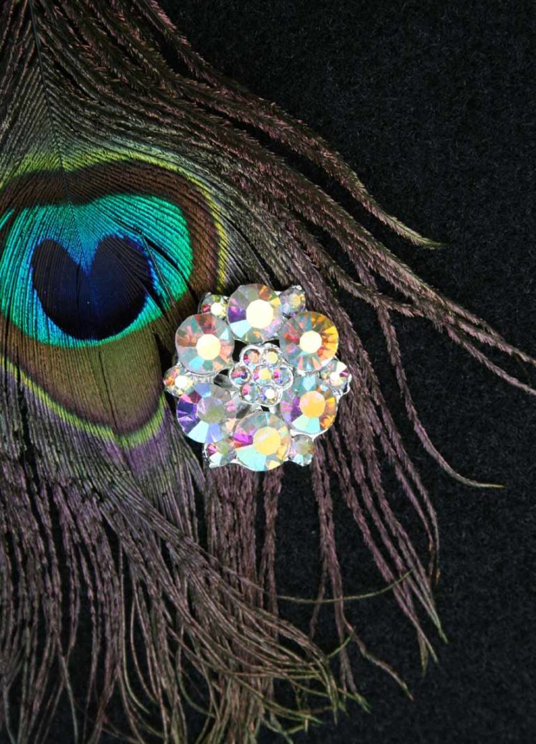 Crystal AB színű bross - kristály kitűző: 427-AB modell ezüst alappal, valamint irizáló kövekkel. Tűvel illeszthető ruhadísz, melynek mérete 2,5 cm.