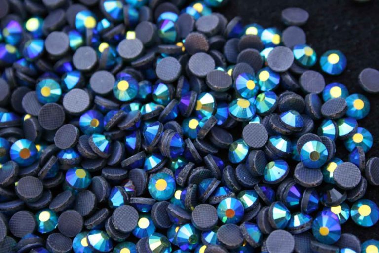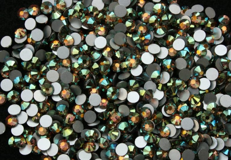 Sötétzöld alapú, irizáló AB árnyalatú, normál minőségű vasalható strasszkő SS16, SS20 és SS30-as méretben, hőre olvadó ragasztóval.