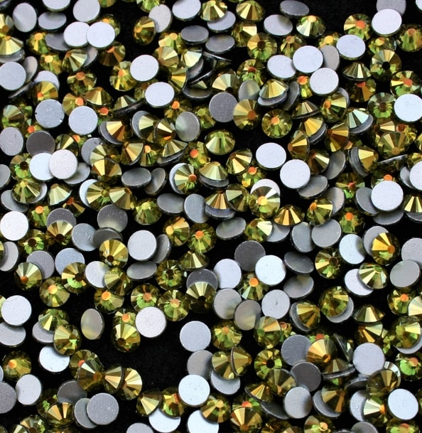 Olajzöld árnyalatú, aranylóan irizáló AB bevonatos ragasztható strasszkő SS16, és SS20-as méretben. Prémium minőségű, csillogó kristálykő.