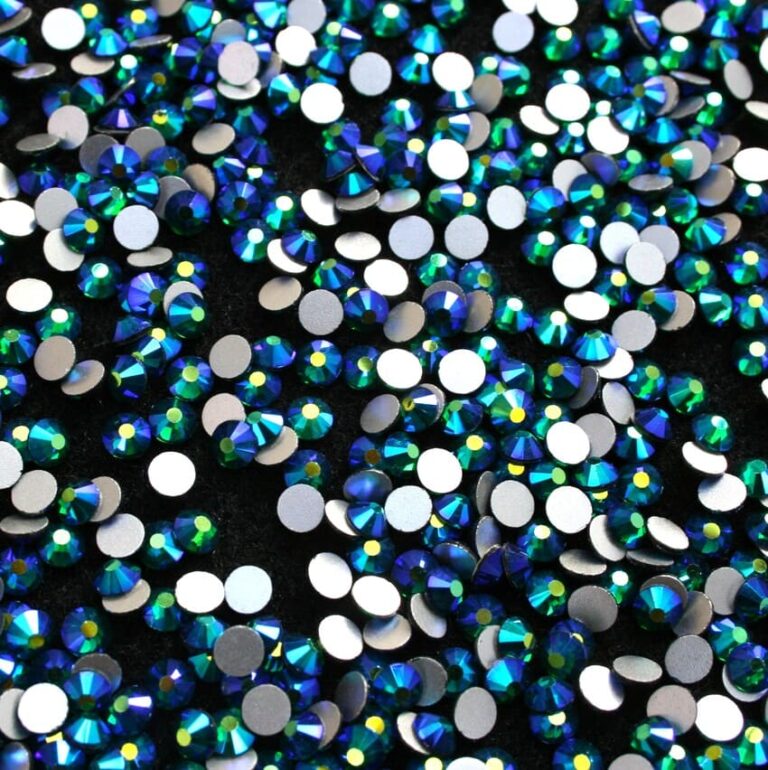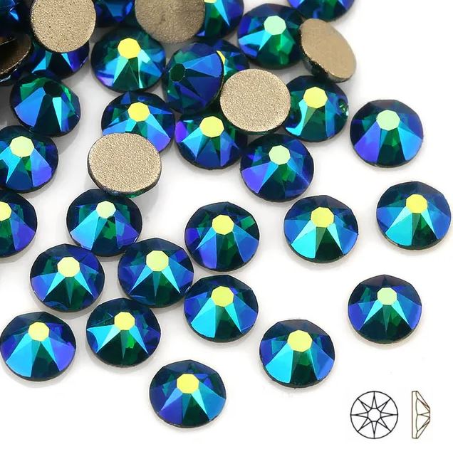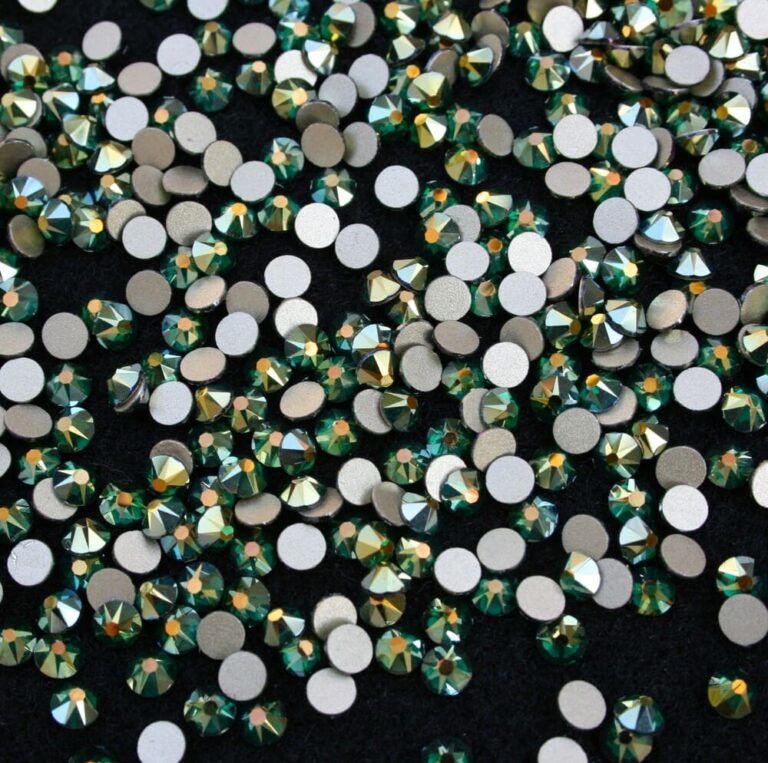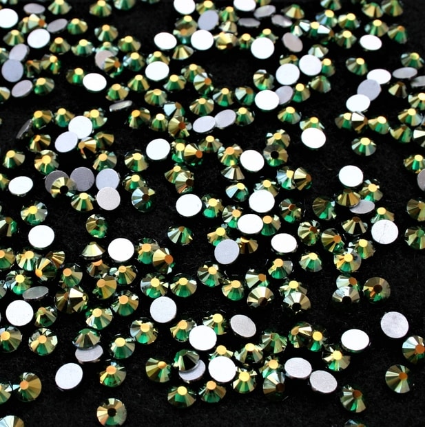 Sötétzöld árnyalatú, aranylóan irizáló AB bevonatos ragasztható strasszkő SS16, SS20 és SS30-as méretben. Prémium minőségű, csillogó kristálykő.