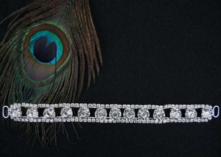 Kristály- és bikinipánt 209-ezüst modell ezüst alappal és kristály színű kövekkel. Varrással illeszthető strasszpánt, melynek mérete 18x1,6 cm.