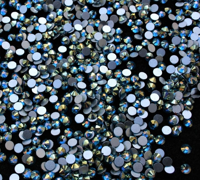 Türkiz árnyalatú, aranylóan irizáló bevonatos ragasztható strasszkő SS16, SS20 és SS30-as méretben. Prémium minőségű, csillogó kristálykő.