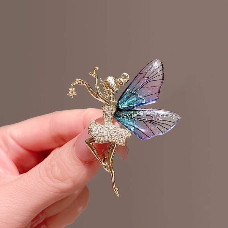 Táncoló tündér formájú bross - kristály kitűző: 436. modell arany alappal, lila vagy zöld színű szárnyakkal. Tűvel illeszthető ruhadísz. Mérete: 3,7x5,1 cm