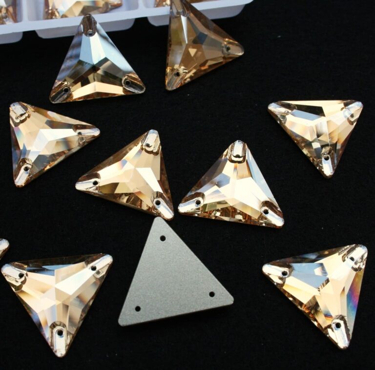 Háromszög alakú varrható kristálykő világos aranyszínben, 12x12, 16x16, 22x22 mm-es méretben. Ragyogó fényű, új csiszolású kő. Anyaga: kristályüveg.