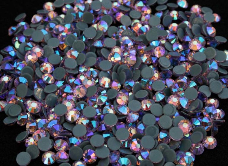 Babarózsaszín alapú, irizáló AB árnyalatú, normál minőségű vasalható strasszkő SS20 és SS30-as méretben.