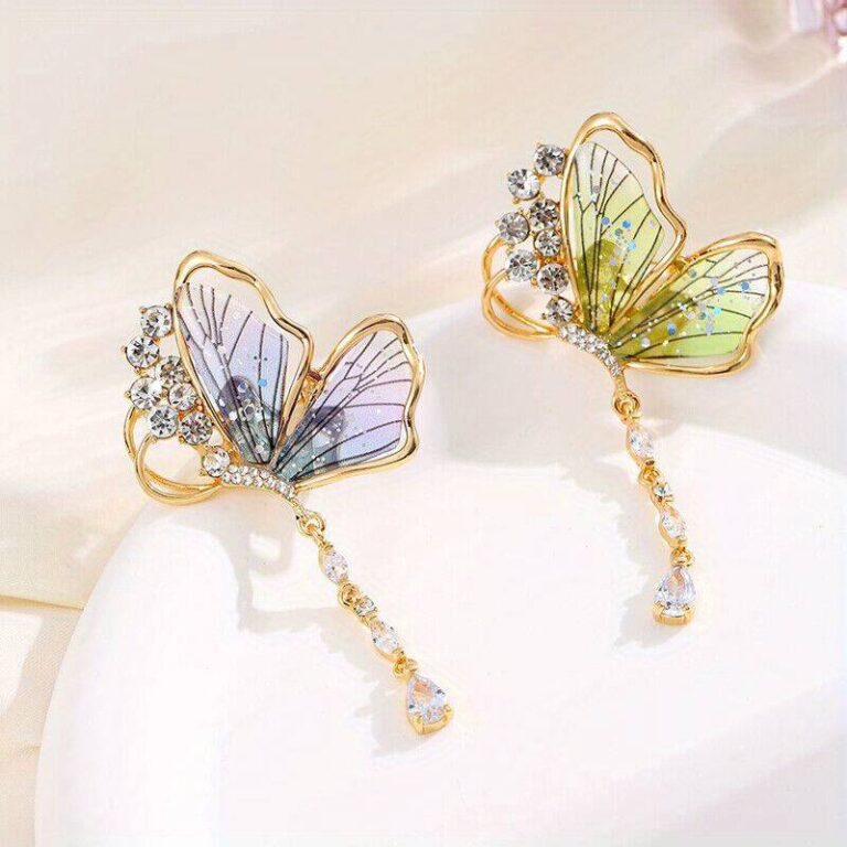 Pillangó alakú bross, lógó csepp kristállyal: 447. modell arany alappal, lila vagy zöld színben. Tűvel illeszthető ruhadísz, melynek mérete 3,6x6,5 cm.