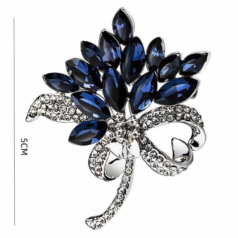Kék színű, virágcsokor formájú bross kristályokkal díszítve: 448. modell ezüst alappal, sötétkék és Crystal színű kövekkel. Tűvel illeszthető ruhadísz, melynek mérete 5 cm.