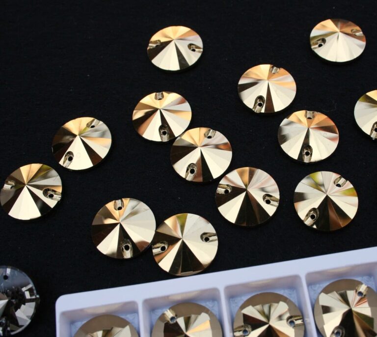 Kör alakú varrható kristálykő arany színben, fémes bevonattal, 10, 12, 14, 16, 18 mm-es méretben. Szikrázó, prémium csiszolású kő. Anyaga: kristályüveg.