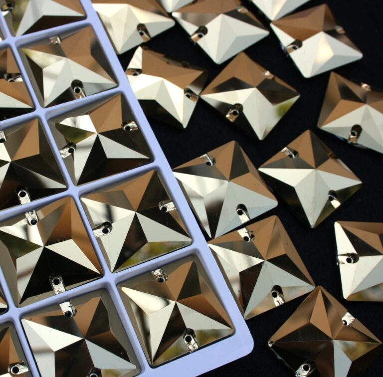 Négyzet alakú varrható kristálykő arany színben, fémes bevonattal, 12x12, 16x16, 22x22 mm-es méretben. Szikrázó fényű kő. Anyaga: kristályüveg.