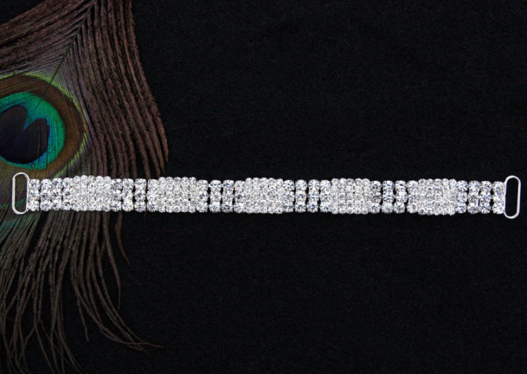 Kristály- és bikinipánt 219-18-crystal modell ezüst alappal és kristály színű kövekkel. Varrással illeszthető strasszpánt, melynek mérete 18x1,4 cm.