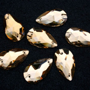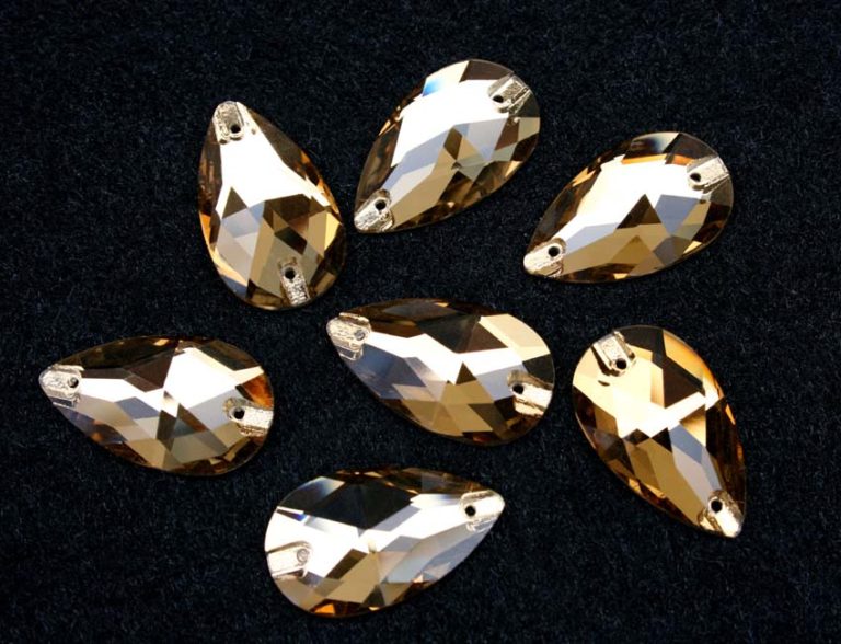 Csepp alakú varrható kristálykő aranyszínben, 7x12, 10,5x18, 13x22, 17x28 mm-es méretben. Szikrázó fényű kő. Anyaga: kristályüveg.