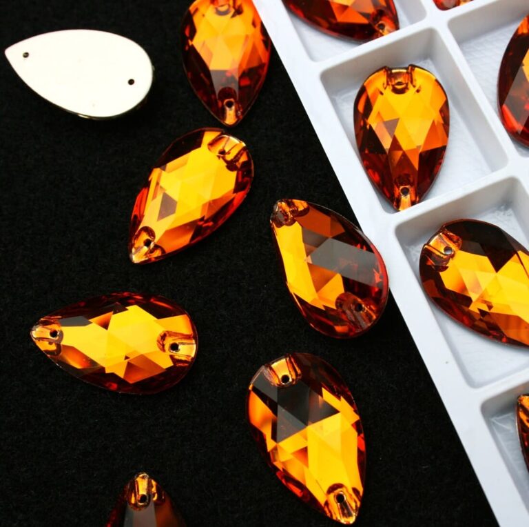 Topaz színű csepp alakú varrható kristály aranyló méz színben, 7x12, 10,5x18, 17x28 mm-es méretben. Prémium csiszolású kő.