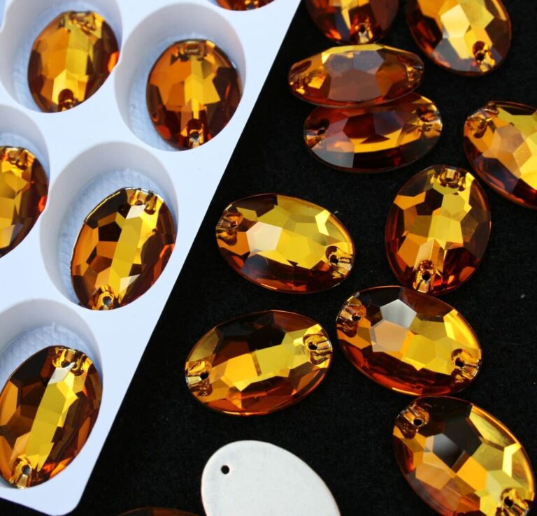 Ovális alakú varrható kristálykő aranyló méz színben, 11x16, 17x24 mm-es méretben. Csillogó, prémium csiszolású kő. Anyaga: kristályüveg.