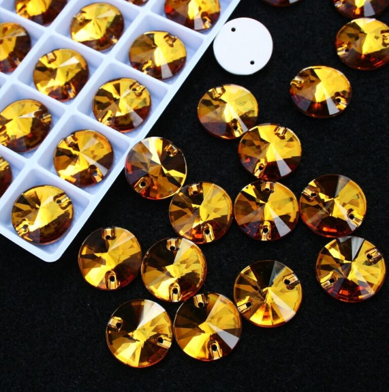 Kör alakú varrható kristálykő aranyló méz színben, 12, 14, 18 mm-es méretben. Szikrázó fényű, prémium csiszolású kő. Anyaga: kristályüveg.