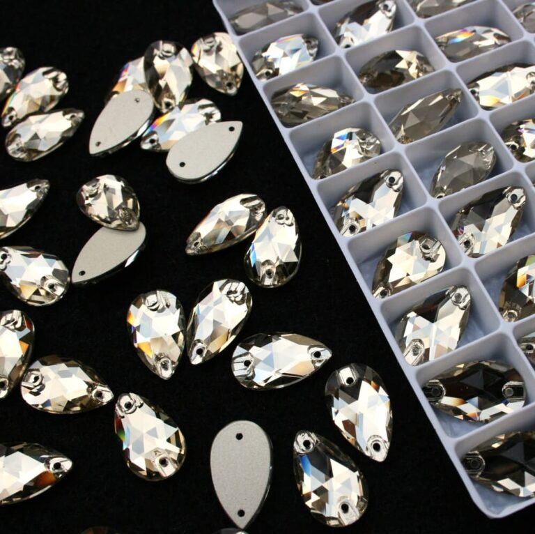 Csepp alakú varrható kristálykő halvány aranyszínben, 10,5x18 mm-es méretben. Szikrázó fényű kő. Anyaga: kristályüveg.